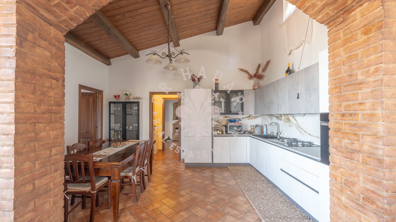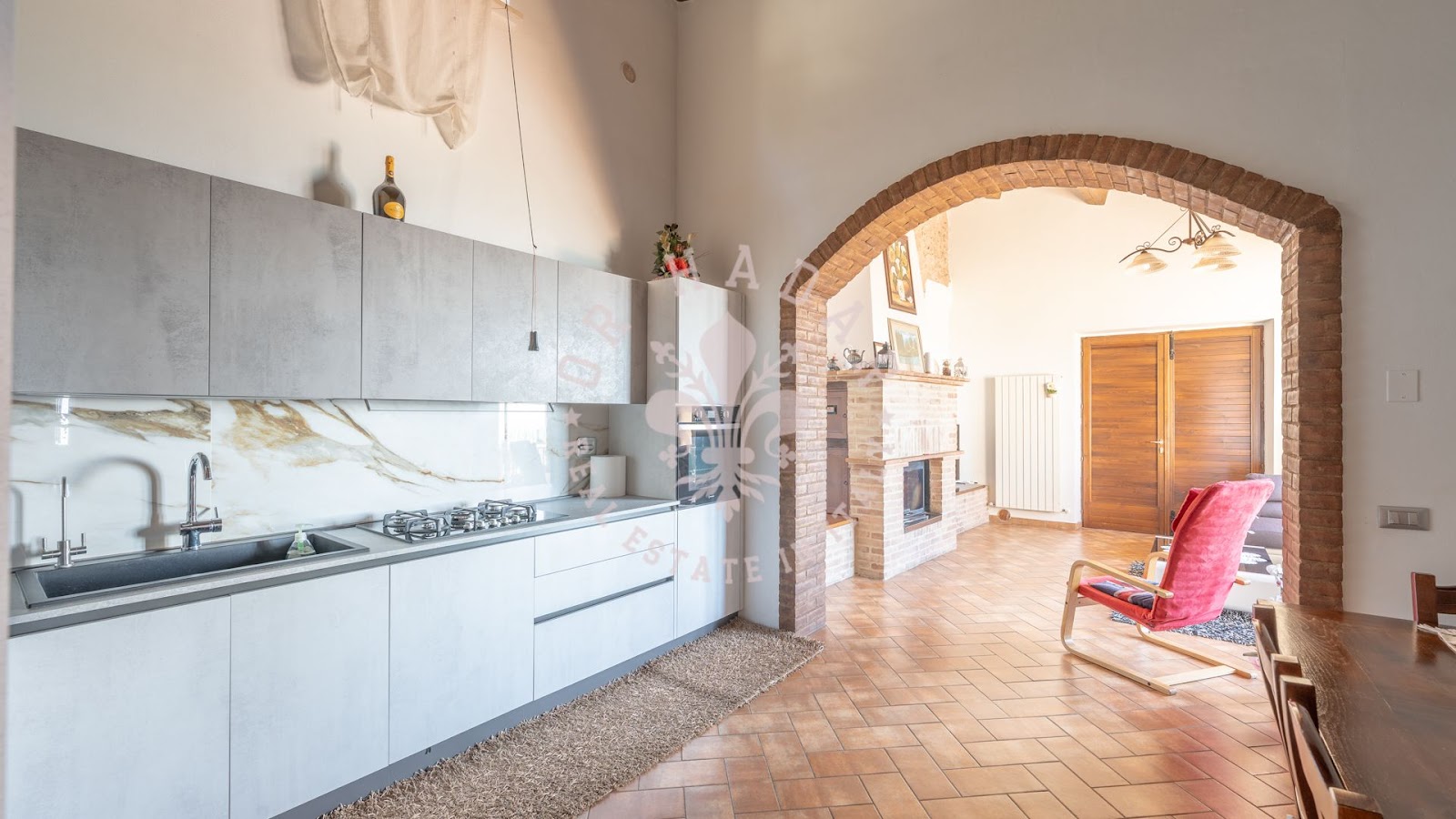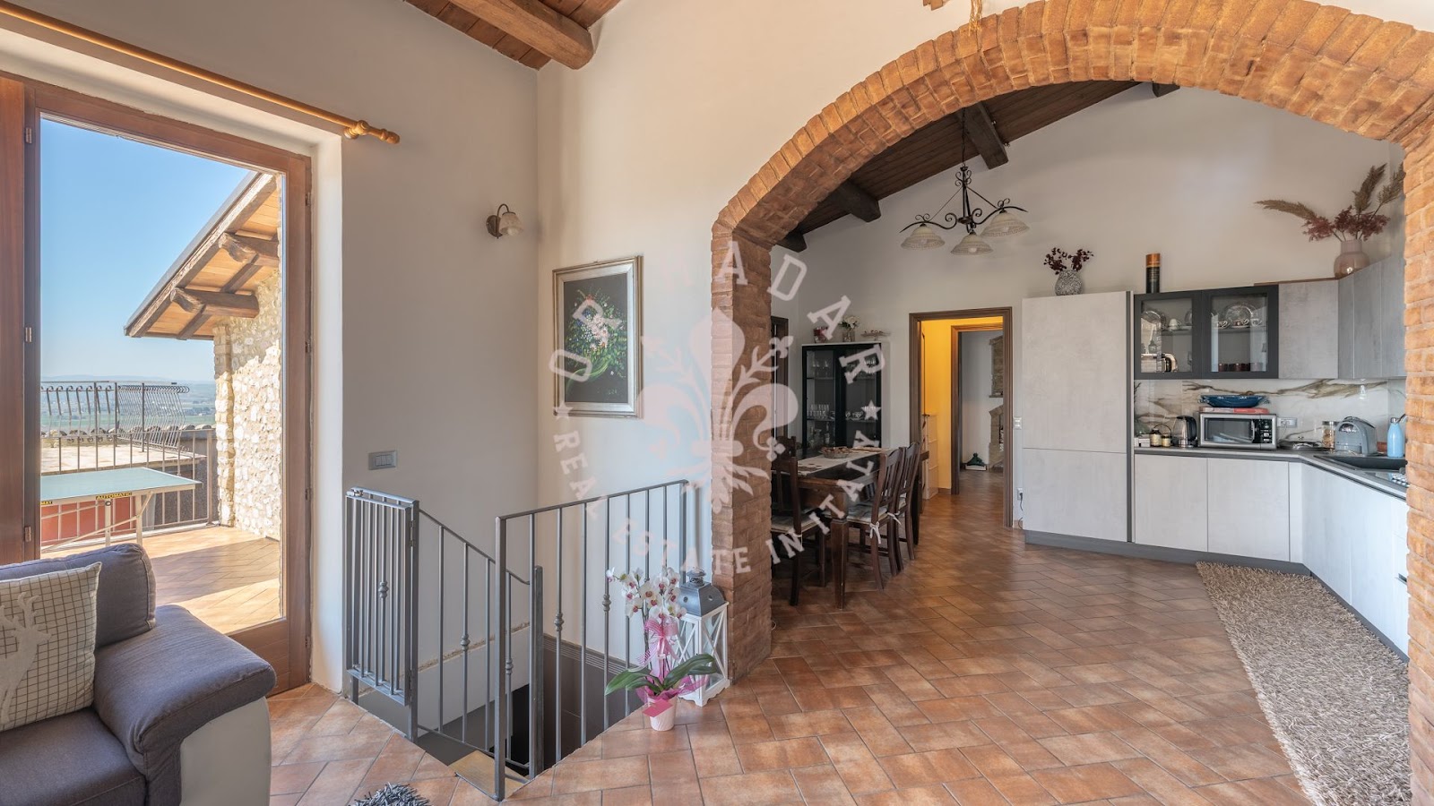 בית החווה המקסים הזה תוכנן להציע שטחי מגורים מרווחים ומחולקים היטב, אידיאלי למשפחות גדולות או לאלו המחפשים סביבה שלווה מבלי להתפשר על עיצוב ופונקציונליות. בקומת הקרקע, אזור המגורים כולל טרקלין כפול ומואר המואר על ידי חלונות גדולים המשקיפים על הגינה. המטבח הפתוח מודרני, מאובזר במלואו ומתוכנן בקפידה כדי להיות לב חיי החברה של הבית.