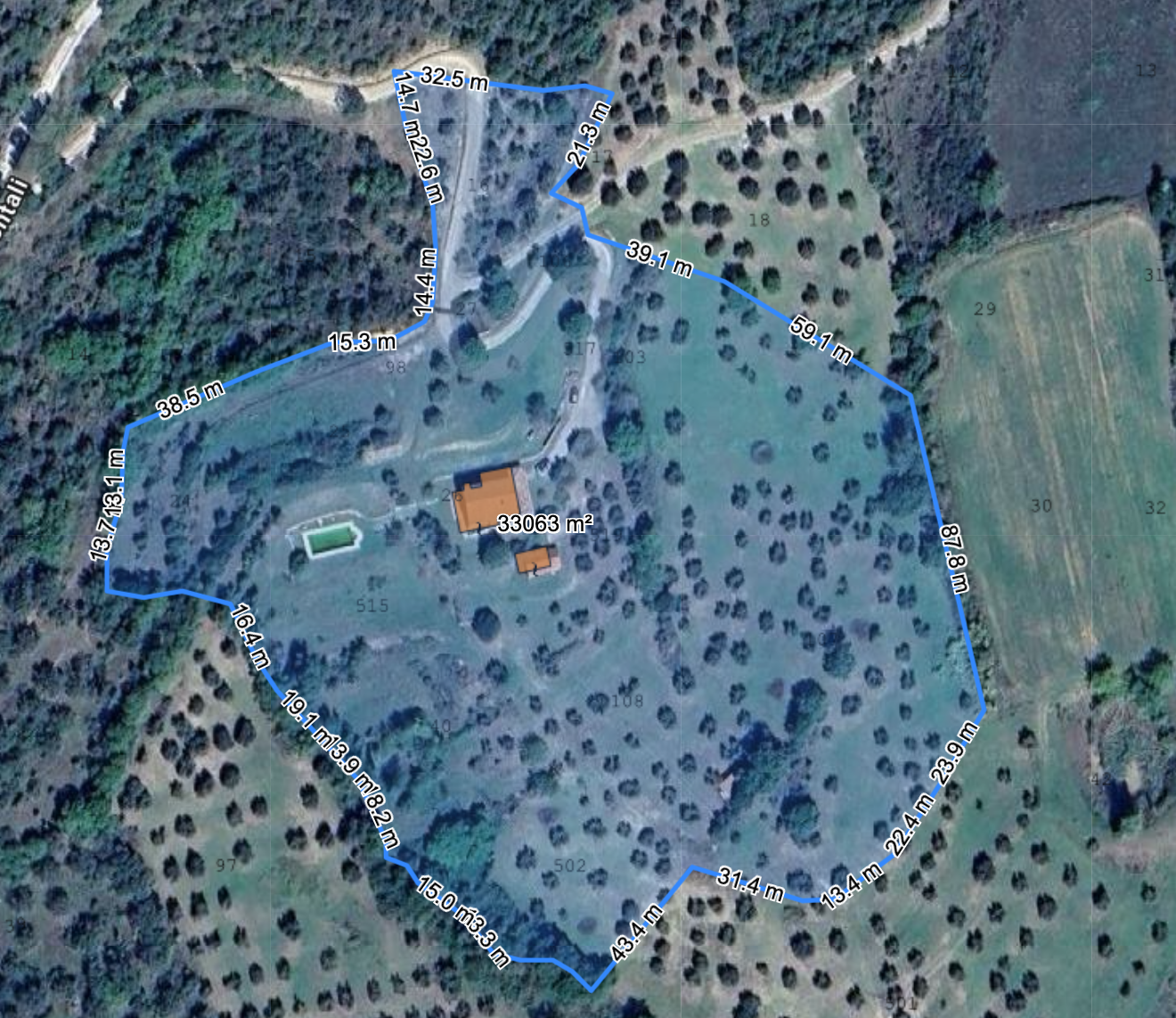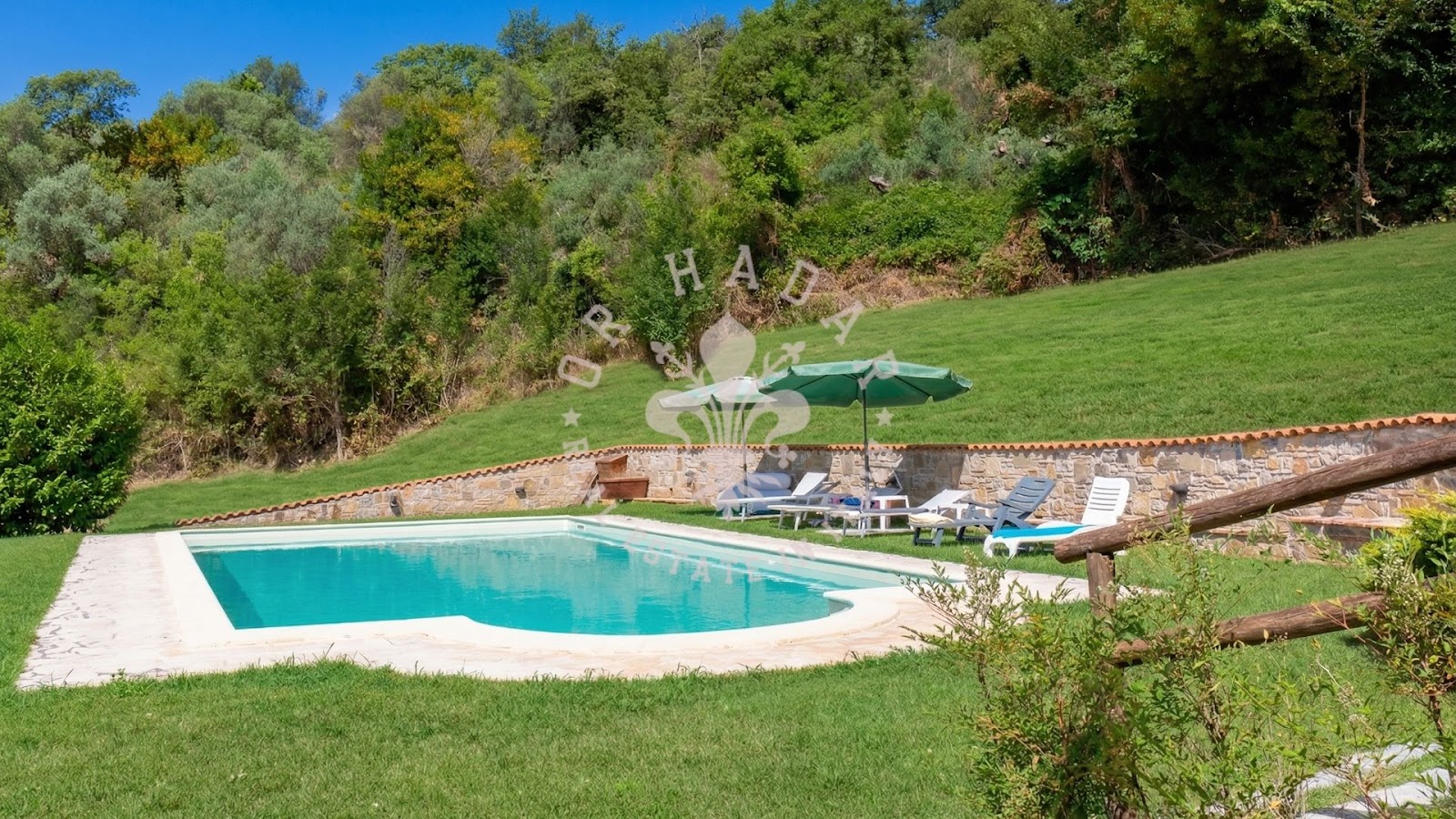 הגן, בשטח של כ-2600 מ"ר, כולל בריכת מים מלוחים יפהפייה בגודל 12×6 מטר, באר ארטזית בעומק 100 מטר ומבנה צדדי בשטח של כ-48 מ"ר הזקוק לשיפוץ. הנכס משלים בשטח של יותר מ-3 דונם של אדמה, חלקו חקלאי וחלקו מטעי זיתים, עם כ-300 עצי זית ואגם קטן.