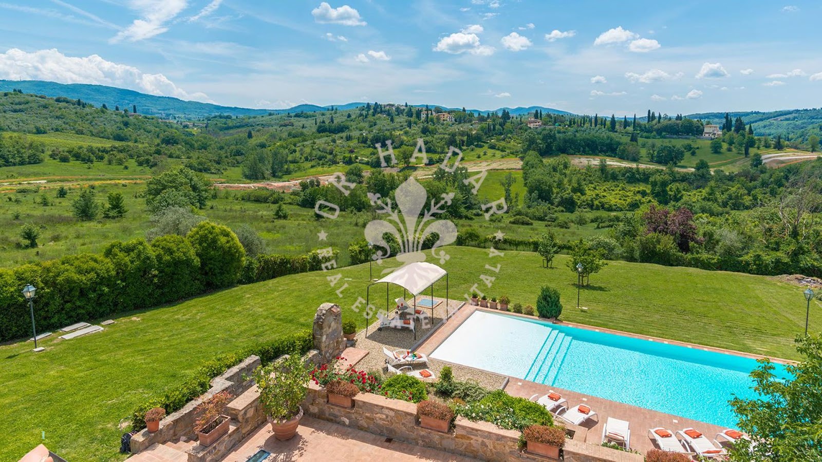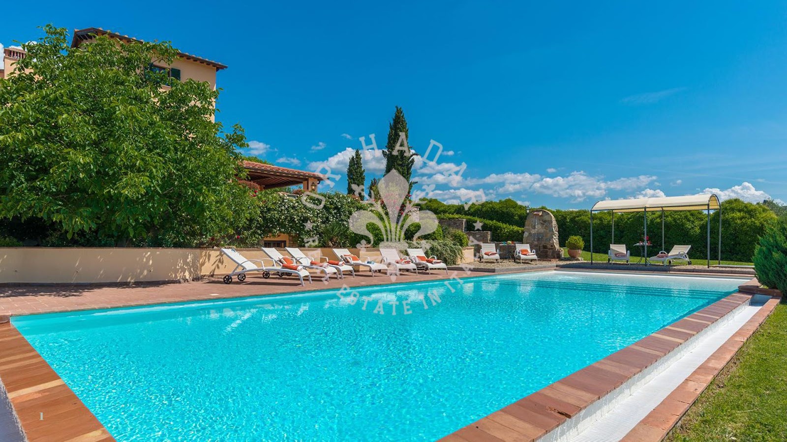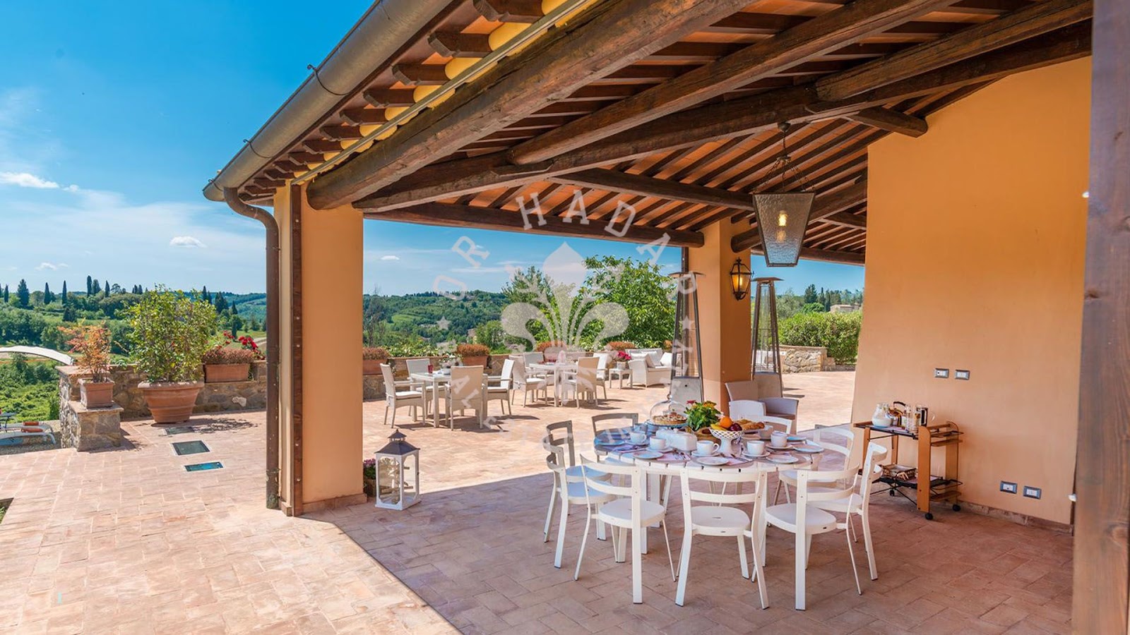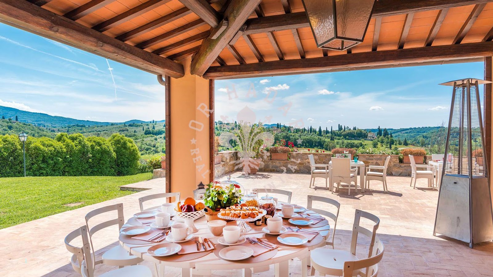 בחוץ יש לוג'יה מקורה גדולה המצוידת בתנור עצים ואזור מטבח חיצוני. שטחי החוץ המרוצפים מאפשרים יצירת מרפסת עם שולחנות אוכל ואזור טרקלין המשקיף על בריכת השחייה הפנורמית בגודל 15×5 ועל גבעות טוסקנה (Tuscany). הוילה ממוקמת בתוך גינה פרטית בשטח של כ-5,000 מ"ר, המבטיחה פרטיות וסביבה טבעית מקסימה.
