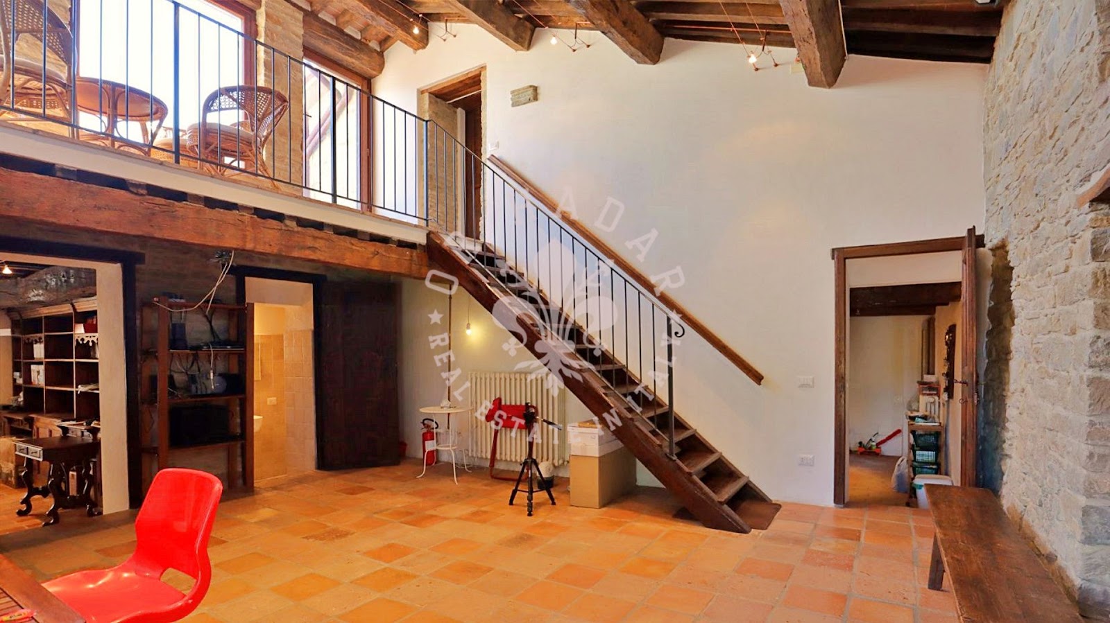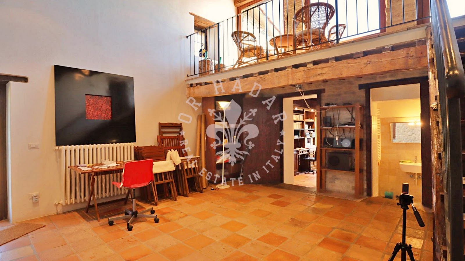 הקומה השנייה, הנגישה מהסלון למטה באמצעות מדרגות פתוחות, כוללת גלריה יפהפייה, מרפסת שקועה פנורמית וחדרי עליית גג מרווחים עם תקרה מקורות עץ, המחולקים כיום ל-3 חדרי שינה בתוספת חדר רחצה.