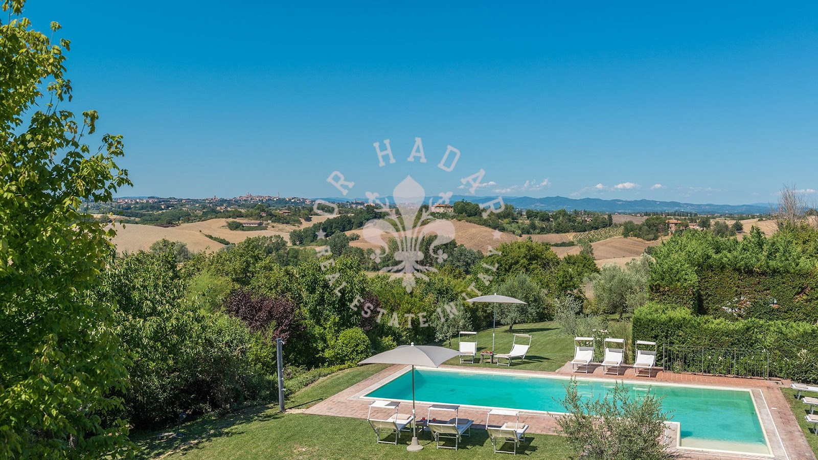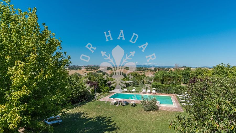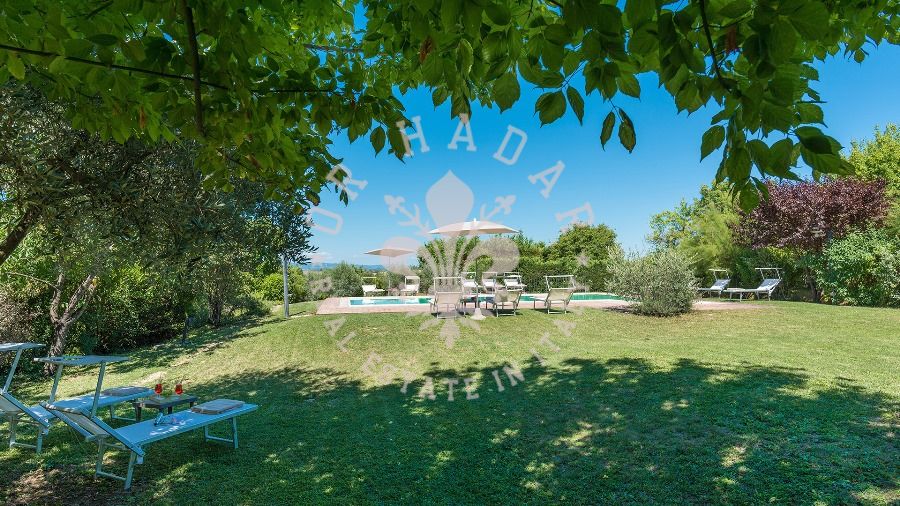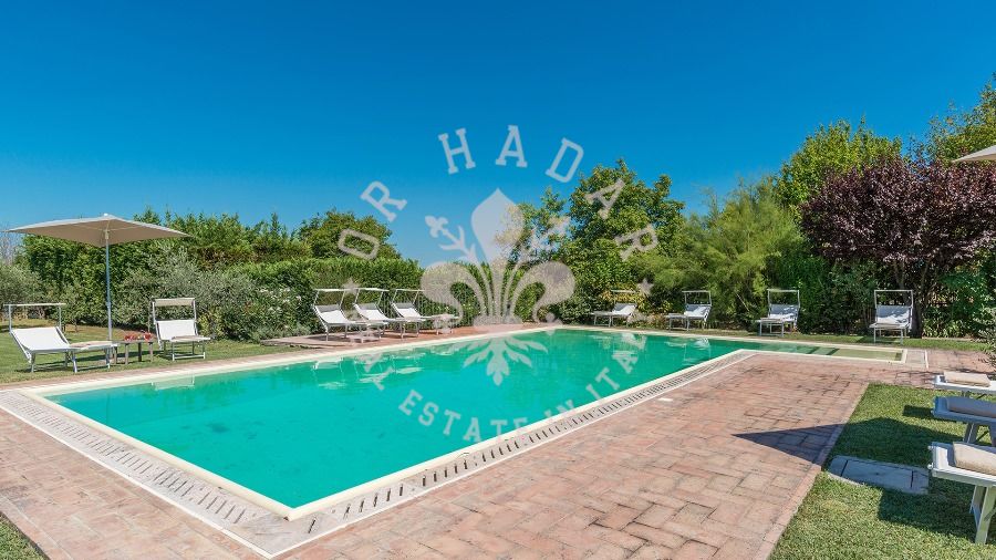 בריכת השחייה, הממוקמת במיקום נופי במרכז הגינה, ניתנת להגעה מכניסות בית החווה בכמה צעדים בלבד על פני הדשא. מוקפת בגדר צנועה בצדדיה, הבריכה ממוסגרת על ידי עצי פרי ומוקפת בדשא מטופח להפליא, שבו אזור שיזוף מצויד בכיסאות נוח ומטריות. הבריכה המלבנית, עם פנים מרופד ב-PVC, כוללת צעדים שקועים לגישה קלה. היא מודדת 5 על 10 מטרים עם עומק הנע בין 1.40 ל-2.20 מטרים. מערכת הטהור משתמשת בכלור. הבריכה מצוידת גם במקלחת חיצונית ותאורה פנימית וחיצונית.