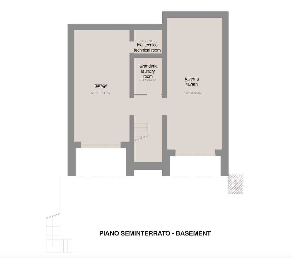 קומה מרתף: מוסך, טברנה, חדר טכני וחדר כביסה