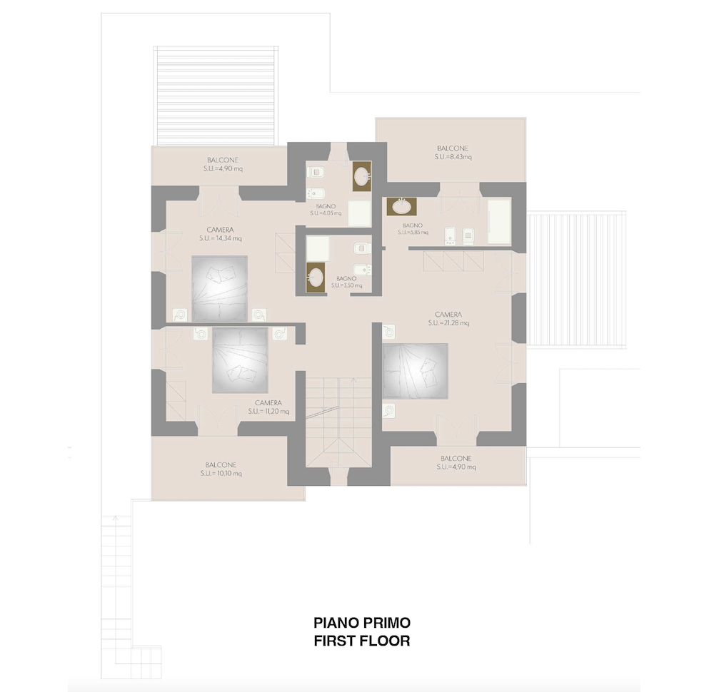 קומה ראשונה: 3 חדרי שינה ו-3 חדרי אמבטיה (לשני חדרי השינה יהיו חדרי אמבטיה צמודים), ו-4 מרפסות פנורמיות.