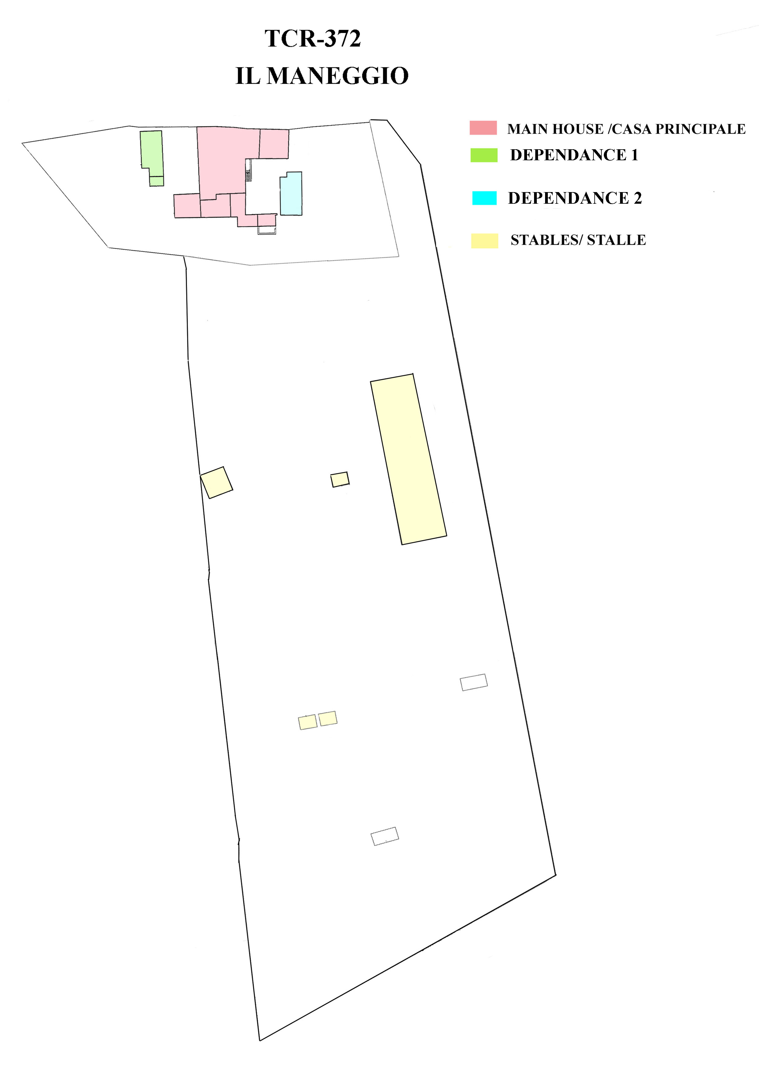 האחוזה כוללת בית חווה מרכזי מאבן, שני בתי אורחים, קרקע סובבת, ואזור סוסים מאובזר במלואו עם אורוות, מגרשי אימון ומבני עזר.