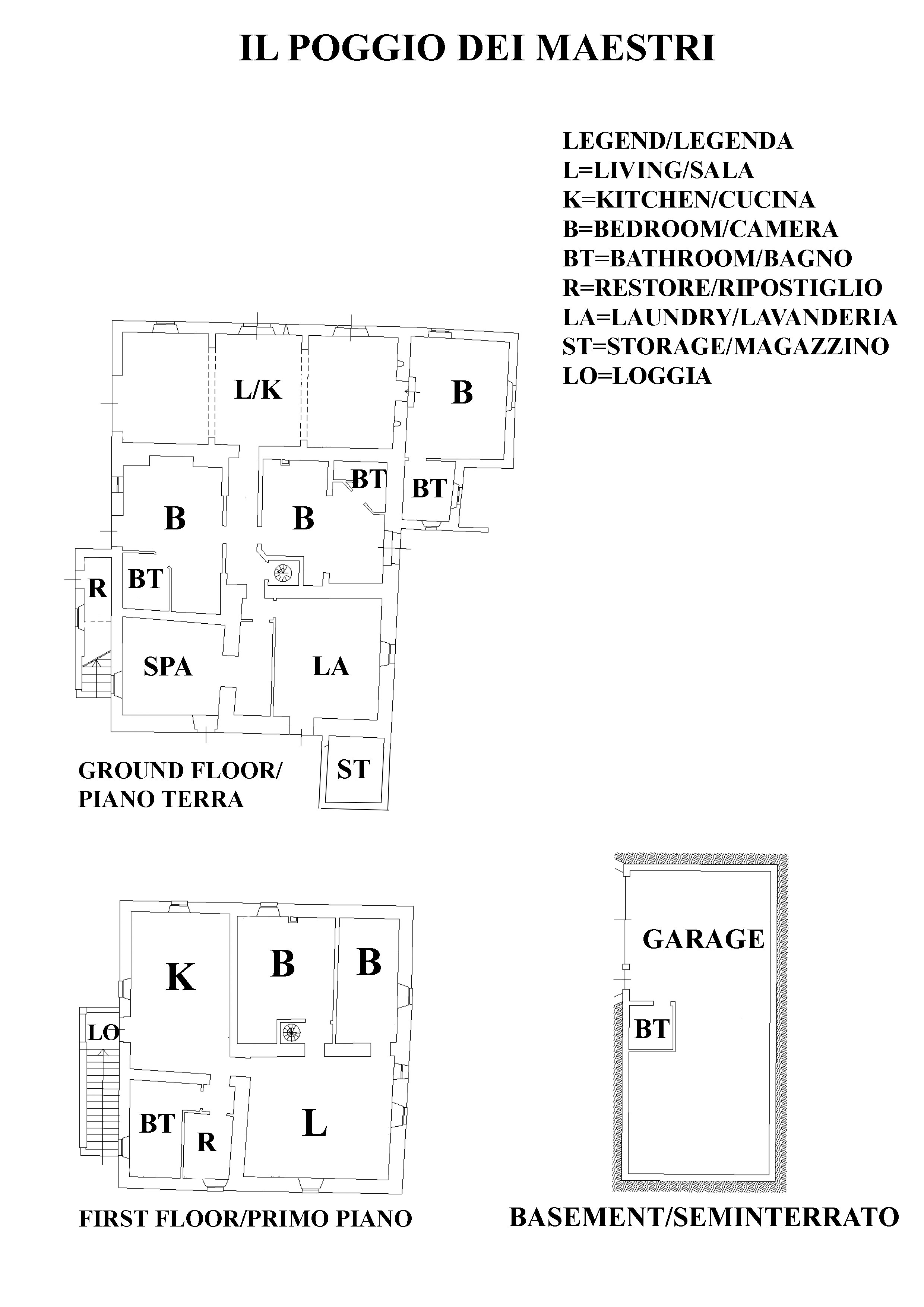 הקומה התחתונה משמשת כיום כצימר. בקומה זו יש סלון מואר משקיעת השמש עד הזריחה, המשמש כחדר משותף וחדר ארוחת בוקר, שלושה חדרי שינה עם חדרי אמבטיה צמודים, ספא עם סאונה פינית, חדר כביסה, שני חדרי אחסון/חדר טכני. לכל החדרים יש גישה ישירה החוצה ומרחב חיצוני פרטי יותר להרפיה. לקומה הראשונה ניתן להגיע במדרגות ספירליות פנימיות או דרך לוג'יה חיצונית והיא משמשת כיום כמגורים פרטיים, שם נמצאת מטבח גדול עם אח עתיק, סלון נעים עם אח, חדר שינה זוגי, חדר שינה נוסף, המשמש כעת כמשרד, חדר אמבטיה עם אמבטיה וחדר אחסון. המוסך במרתף בשטח 100 מ"ר כולל חדר אמבטיה ופתיחה אוטומטית, מעליו נמצא אזור הסולריום. הנכס משלים גינה, עם שטח המוקדש לגינת ירק, בסך הכל השטח הוא כ-1.3 דונם, שבתוכו יש גם בריכה בבעלות משותפת.