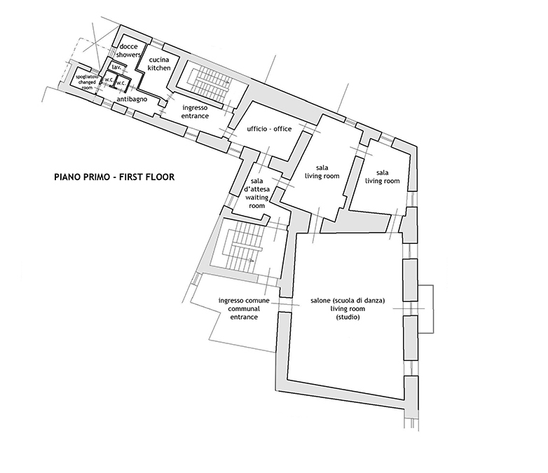 עם ההגעה אל המנחת, הכניסה הראשית מקבלת אותנו לאווירה שנראית כאילו היא מעידן אחר. תכנון הפנים של הדירה בולט בהרמוניה שלו, ומציג אולם כניסה גדול, שלושה חדרי מגורים רב-תכליתיים ומרשימים, משרד ומסדרונות ואזורי שירות שונים. הסידור בצורת "L" מספק חשיפה כפולה: חלק מהחלונות משקיפים על מרכז העיר התוסס, בעוד שאחרים פונים לחצר הפנימית, ומציעים נוף מרהיב של גבעות אומבריה (Umbria) המתגלגלות.