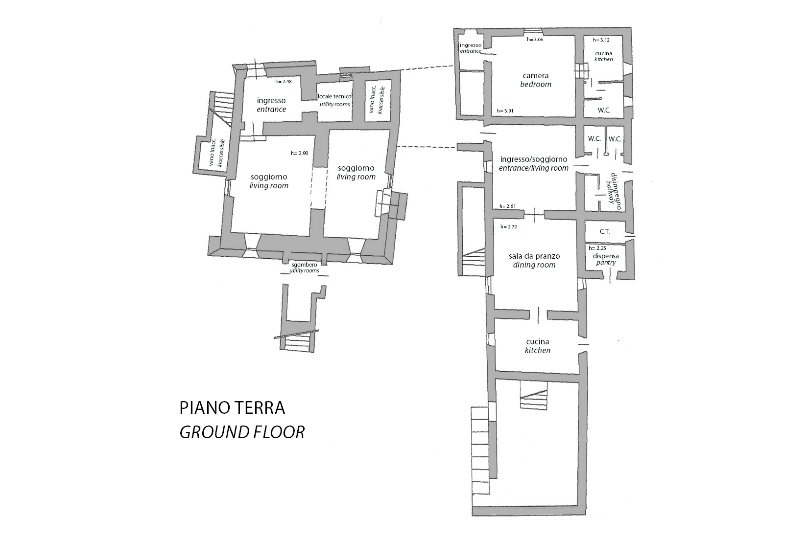 בקומת הקרקע: בכנף השמאלית ישנם 2 סלונים גדולים וחדרים טכניים, בעוד שבכנף הימנית אנו מוצאים כניסה, חדר אוכל, מטבח גדול, חדר שינה עם מטבחון, חדר רחצה ושני שירותים נוספים.