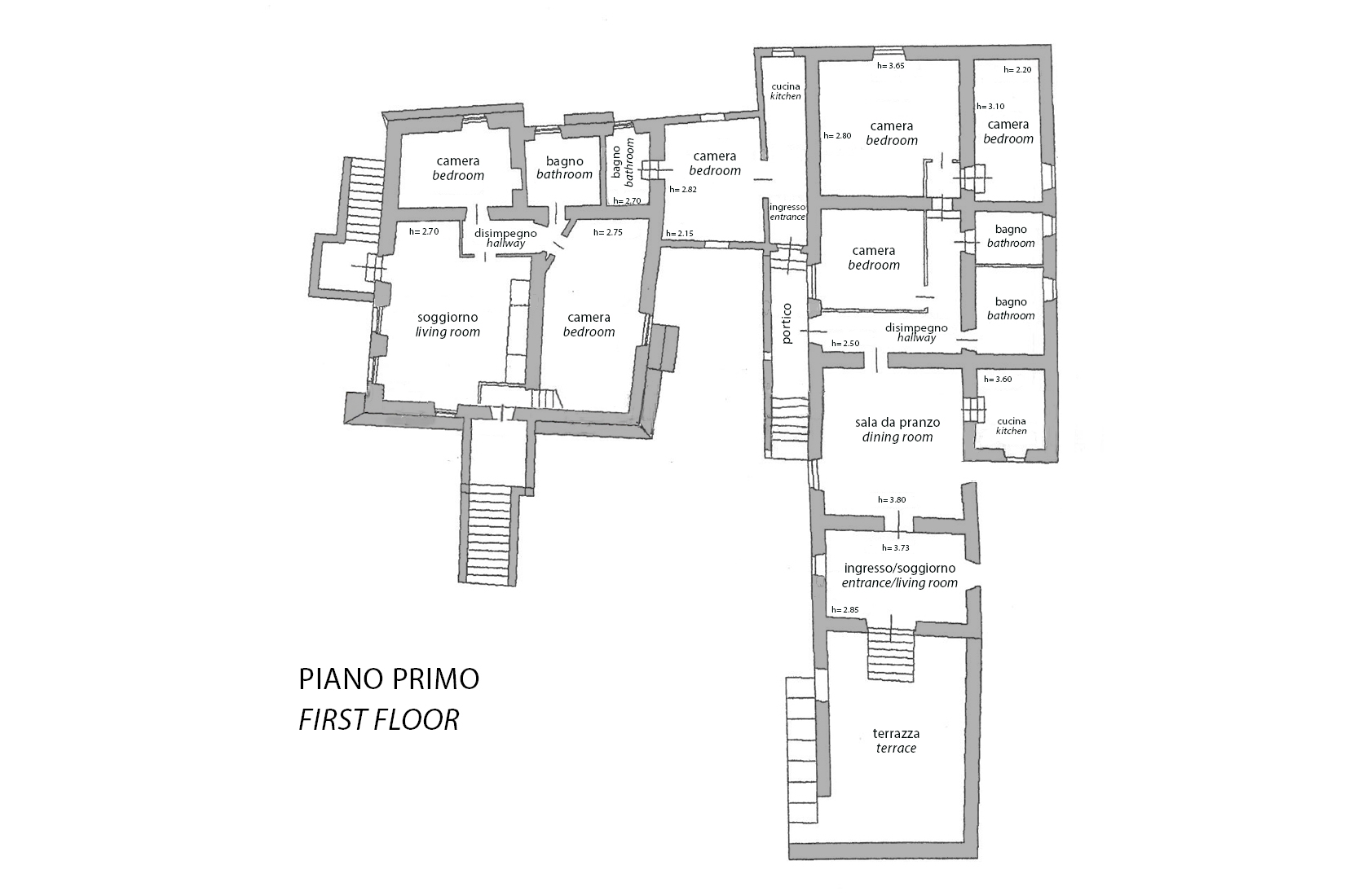 בקומה השנייה, אליה ניתן להגיע באמצעות מדרגות פנימיות המחברות את הקומה הראשונה, אנו מוצאים 3 חדרי שינה עצמאיים ו-3 חדרי רחצה.