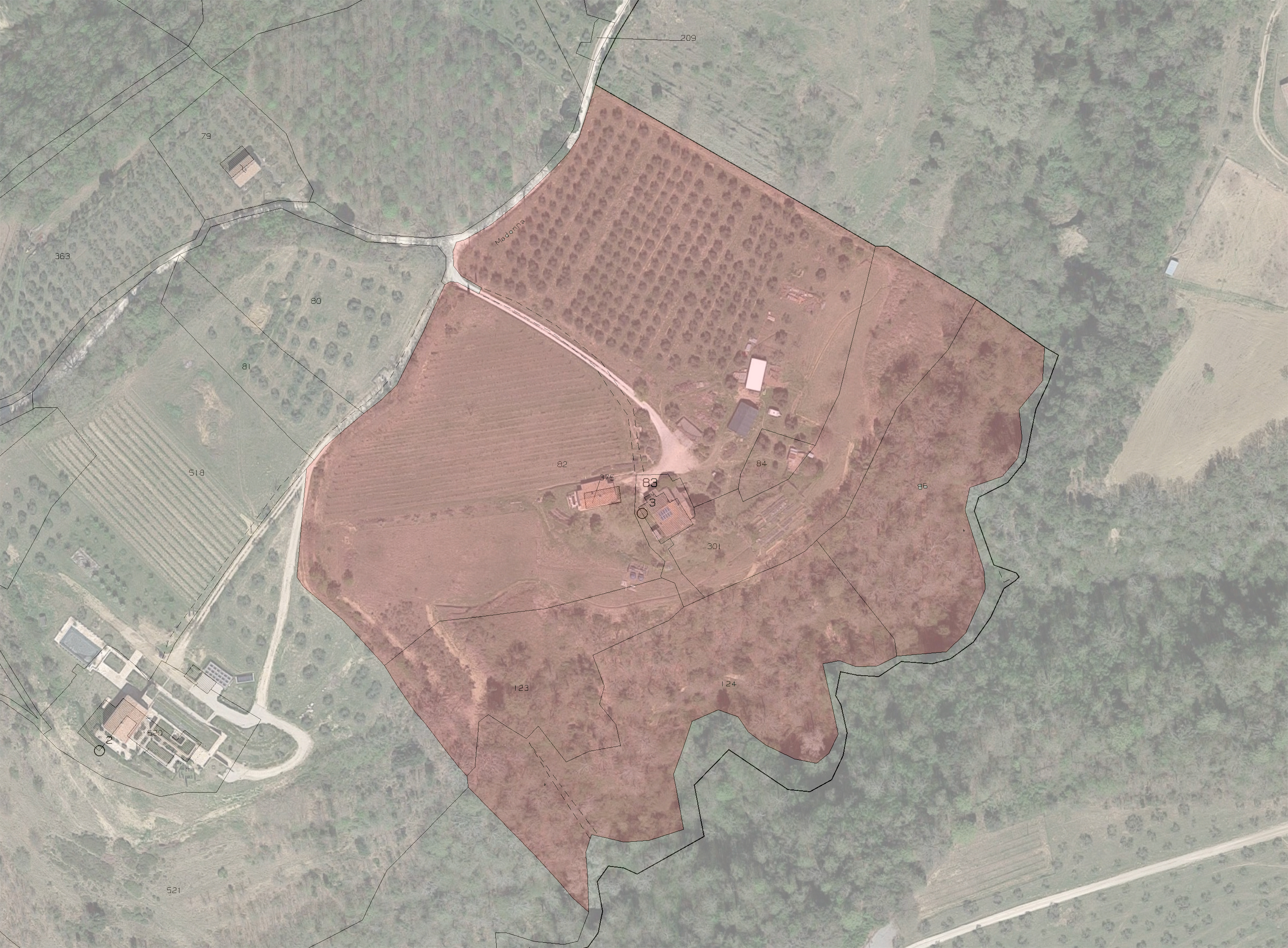 ישנן שתי דירות המורכבות מחדר שינה, חדר אמבטיה ומטבח, שנבנו בתחילת שנות ה-2000 עם בידוד תרמי מצוין ושימוש מיומן בחומרים טיפוסיים, ולאחר מכן תוחזקו ושופרו בקפידה לאורך השנים. באותו בניין יש מטבח, ליד תנור עצים, מרפסת ופינת ברביקיו. הבניין השני נבנה כולו בשנת 2018, החל מהיסודות, תוך שימוש במבנה עץ, טכניקות בנייה ביולוגיות מצוינות וגימורי אבן בעבודת יד חיצוניים; בניין זה מורכב ממטבח/חדר אוכל, חדר שינה עם משרד או חדר הלבשה, 2 חדרי אמבטיה ומחסן, בשטח כולל של כ-83 מ"ר, בתוספת פטיו יפהפה עם פרגולה בצד הקצר ומרפסת של כ-20 מ"ר בצד הקצר. האדמה תמיד מעובדת על ידי הבעלים בשיטות טבעיות חדשניות. ישנם כהקטר אחד של מטעי זיתים עם 300 עצים, כ-5000 מ"ר מוקדשים לגפנים עם ענבי יין לבנים ואדומים. להשלמת הנכס ישנם כ-2 הקטאר של יער והחלק הנותר הוא אדמה חקלאית, דשא וגינה.
