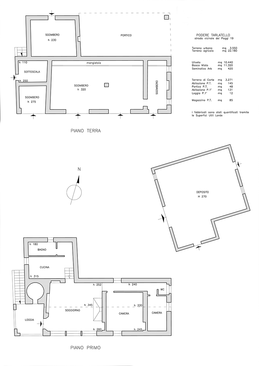החווה פודרה טרלטלו שוכנת בעמקים הסובבים את העיירות צטונה וקיוזי, במחוז סיינה (Siena) היפה. מוקפת כליל בצמחייה עשירה, הבית בנוי בשתי קומות ושטח המגורים הכולל שלו הוא כ-280 מ"ר. הקומה הקרקעית, המיועדת כיום לאחסון ומחסן, מציעה את ההזדמנות להפוך לחלל מגורים, עם אפשרות לשיפוץ עתידי שיכול לנצל במלואו את הפוטנציאל של החווה המקסימה הזו. הקומה הראשונה, המייצגת כיום את לב הבית, נגישה דרך המדרגות החיצוניות המקוריות והאופייניות לחוות טוסקניות. מדרגות אלו מובילות למרפסת של 12 מ"ר, המציעה נוף עוצר נשימה של הגבעות הסובבות. הקומה הראשונה נפתחת לאזור מגורים גדול, הכולל סלון, פינת אוכל ומטבח, המשתלבים עם חדר אמבטיה. כל החלל מוקף בחלונות גדולים המציעים תאורה יוצאת דופן ונוף לגן. המשך לאורך מסדרון קצר מוביל לאזור השינה, הכולל חדר שינה זוגי, חדר שינה יחיד וחדר אמבטיה נוסף. צמוד לבית הראשי נמצא בניין נספח של כ-90 מ"ר, המשמש כיום כמחסן. כל הנכס מוקף במגרש פרטי של כ-2.5 דונם, המציע את ההזדמנות לפתח חלק ממנו כפארק מטופח ואלגנטי, כמו גם לאפשר בניית חניון גדול. הנכס נגיש בקלות דרך דרך כפרית שקטה.