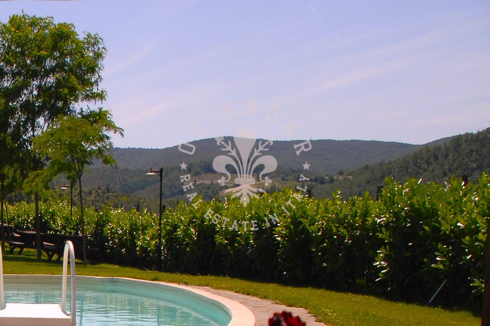 הנכס מוקף בחצר בלעדית בשטח של כ-5,300 מ"ר עם גינה נוף וריצוף פורפירי, המארחת אזור ברביקיו, 2 תנורי עצים, אזור משחקים מקורה לילדים ואמפיתיאטרון אופייני. בריכת שחייה מעוגלת בגודל 11×5.