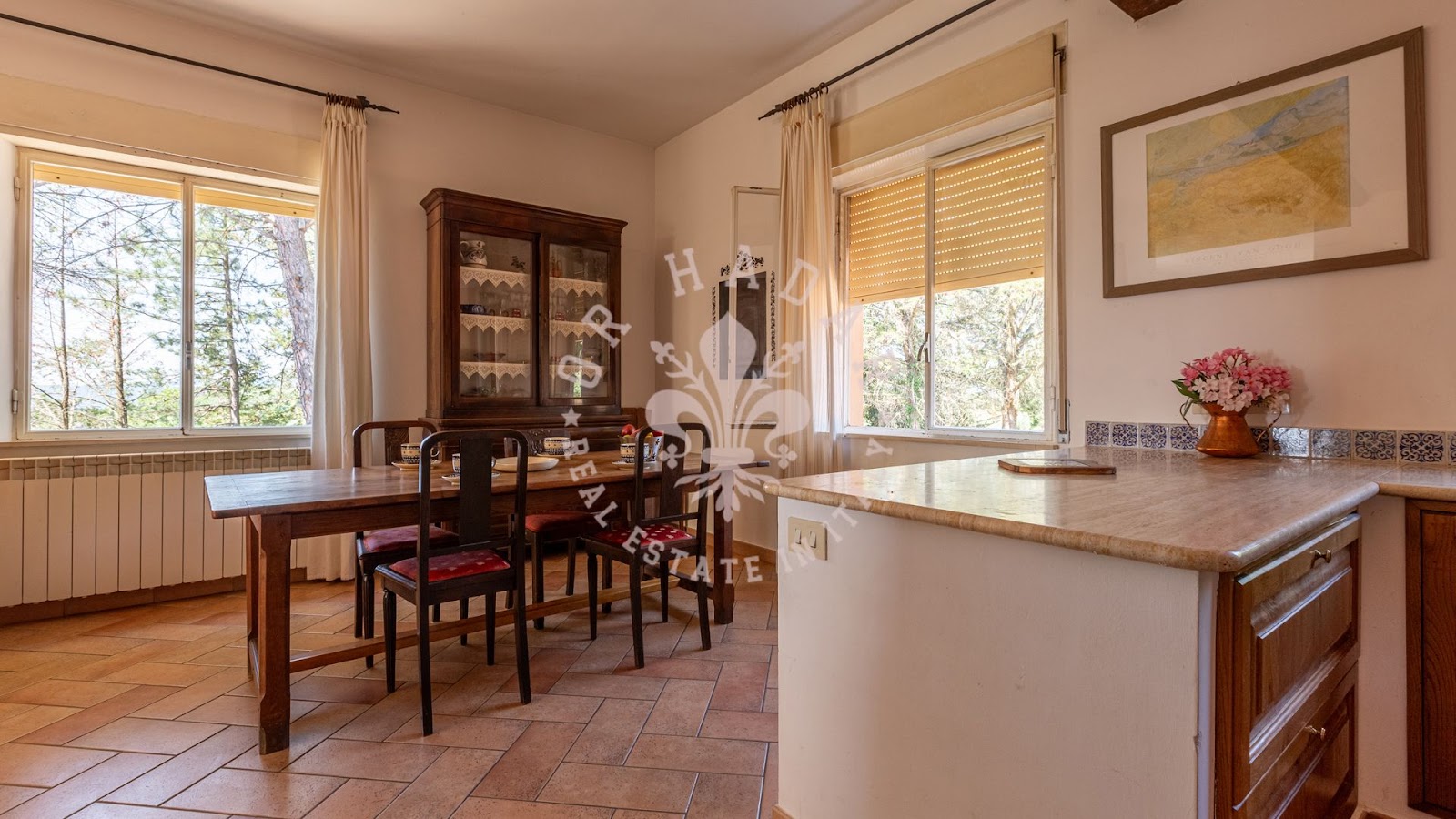 מרחבי הפנים מורכבים מ-5 חדרי שינה, 5 חדרי אמבטיה ו-2 מטבחים, המסודרים באופן רציונלי כדי להבטיח זרימה ופונקציונליות טובה. נוכחותם של שני מטבחים הופכת את הבית למתאים לאירוח אורחים או למשפחה גדולה. יש כניסות עצמאיות, והגודל והפריסה הגדולים של החדרים מאפשרים תצורות פונקציונליות שונות. הוילה מצוידת במערכות חימום וחשמל שעודכנו חלקית בעשרים השנים האחרונות, עם התקנות המתאימות למגורים בגודל זה.